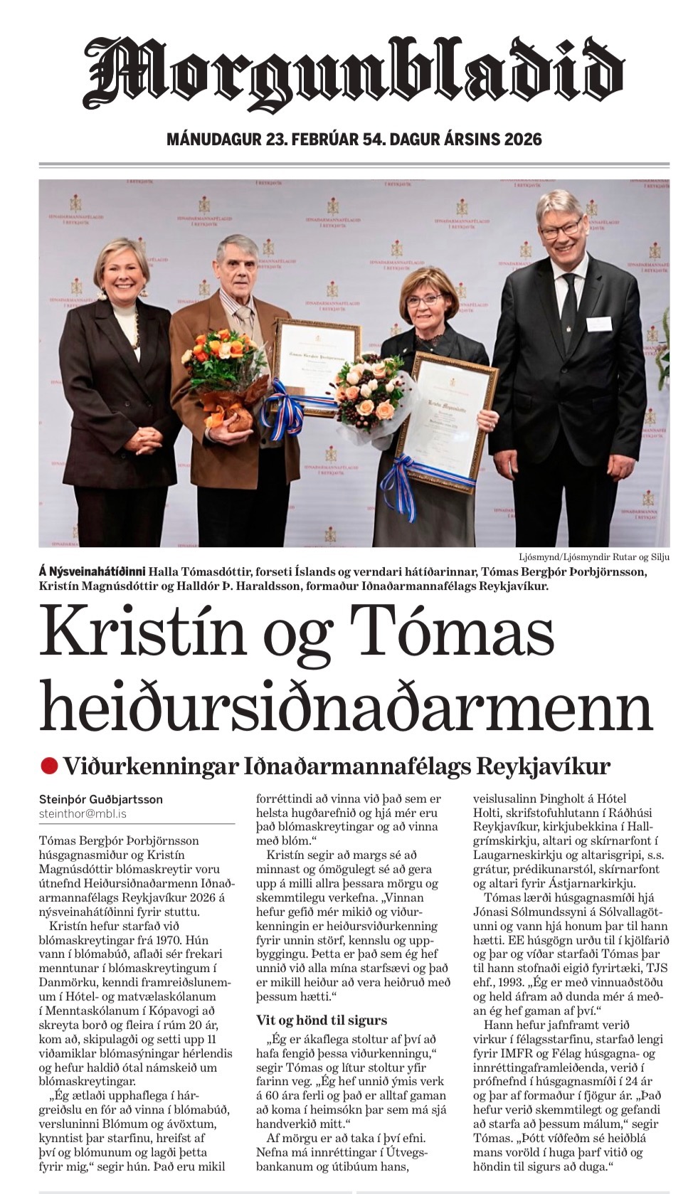 Frétt um heiðursiðnaðarmenn félagsins 2026 í Mogganum 23.02. 2026